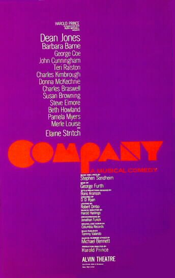 Quasiment inconnue en France, la comédie musicale Company marque le premier grand succès de Stephen Sondheim en tant qu’auteur complet (j’entends par là non seulement parolier mais aussi et surtout compositeur), et le début de sa collaboration avec le producteur Harold Prince : c’est ce dernier, dit-on, qui suggéra à Furth de regrouper en un seul ouvrage musical les onze petites pièces de théâtre à trois personnages qu’il avait originellement rédigées, en particulier pour l’actrice Kim Stanley. (Notons que Furth, auteur relativement mineur, semble se sentir plus à l’aise dans les formes courtes, des années 1960 jusqu’à la fin de sa vie et son dernier projet intitulé... Sex, Sex, Sex, Sex, Sex, Sex, Sex.) Chacune mettait en scène (de façon presque courtelinienne, pourrait-on dire) un couple marié et une tierce personne : l’idée déterminante fut justement de placer cet observateur étranger au centre de l’action, et d’en faire non seulement le protagoniste mais, comme nous le verrons, la clé du dispositif narratif-énonciatif. Ce changement de point de vue conduira finalement Furth à ne garder que deux des pièces d’origine et à en ajouter trois nouvelles, et se traduira également par l’abandon du titre original : Three devient Company.
